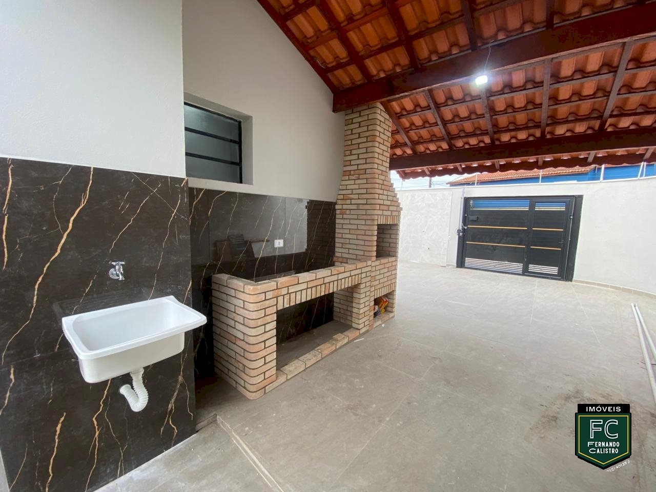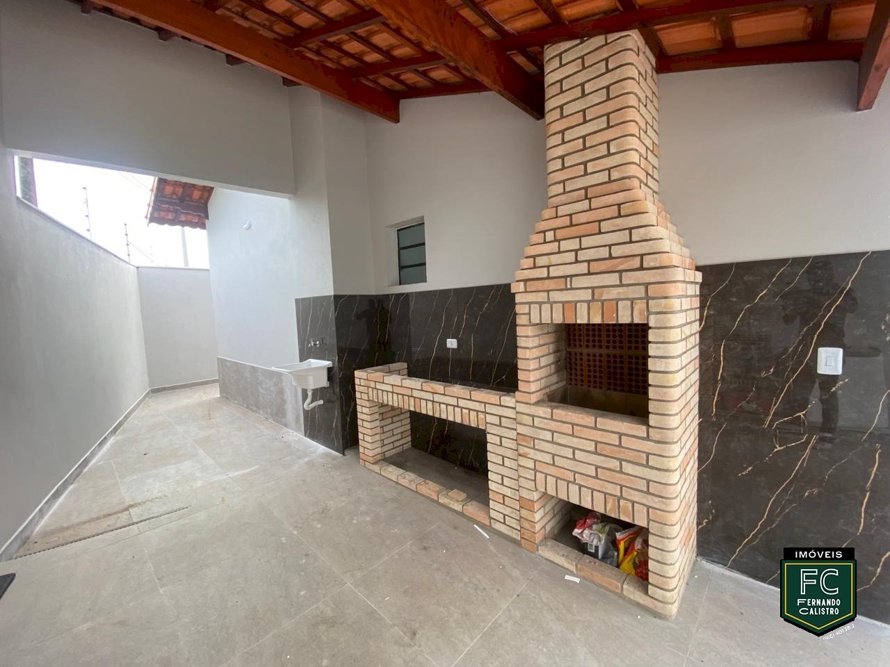 • Varanda gourmet com churrasqueira em tijolinho e pia em granito