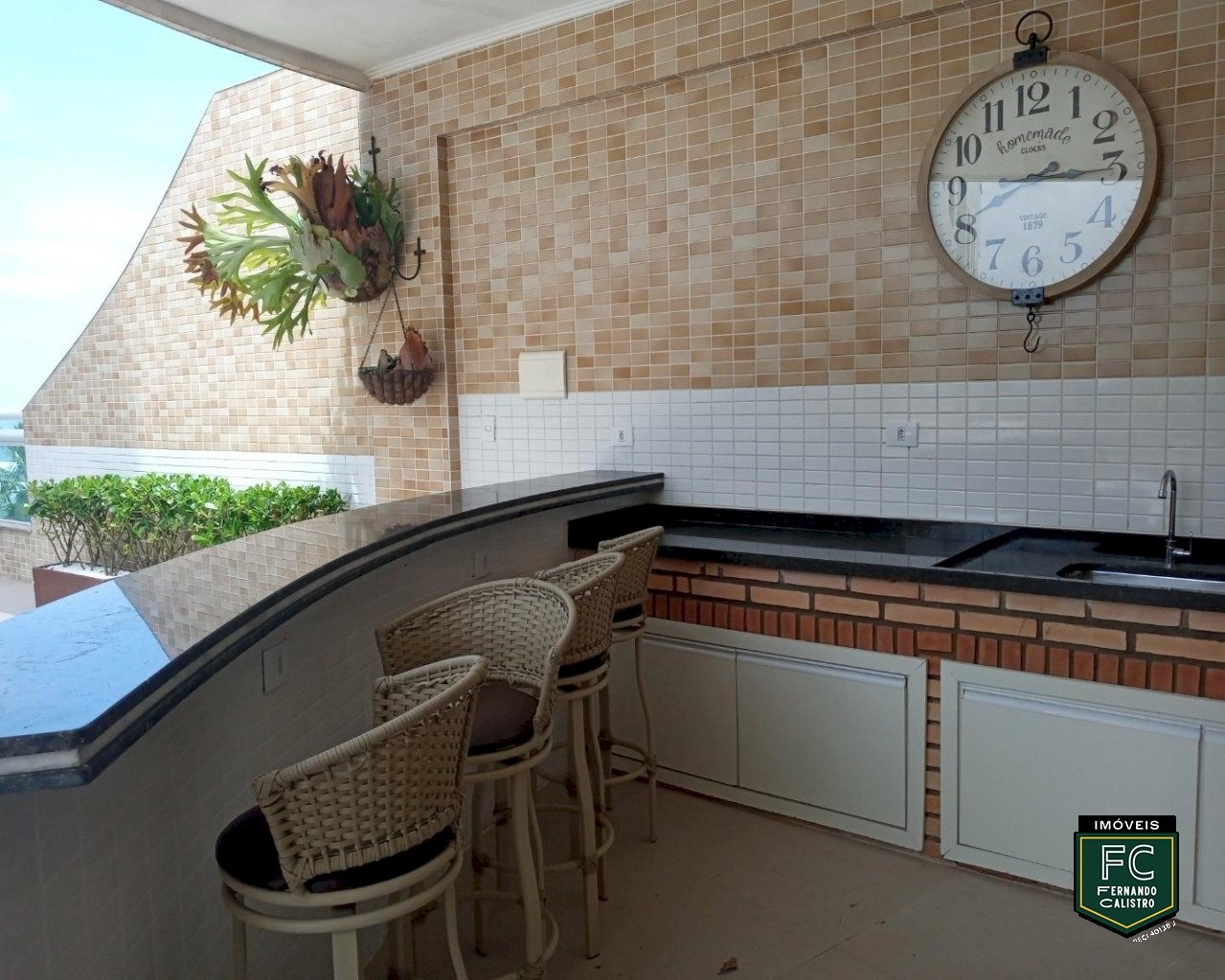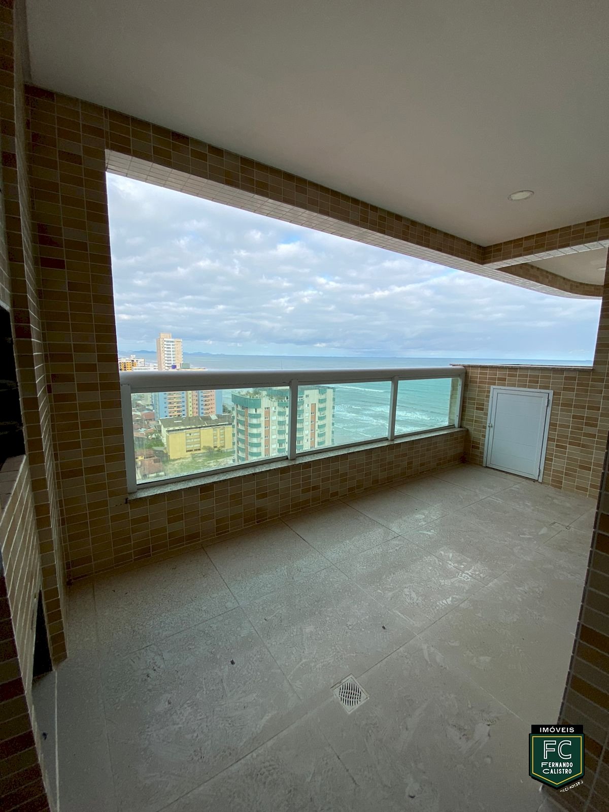 Varanda gourmet com churrasqueira e vista frontal para o mar