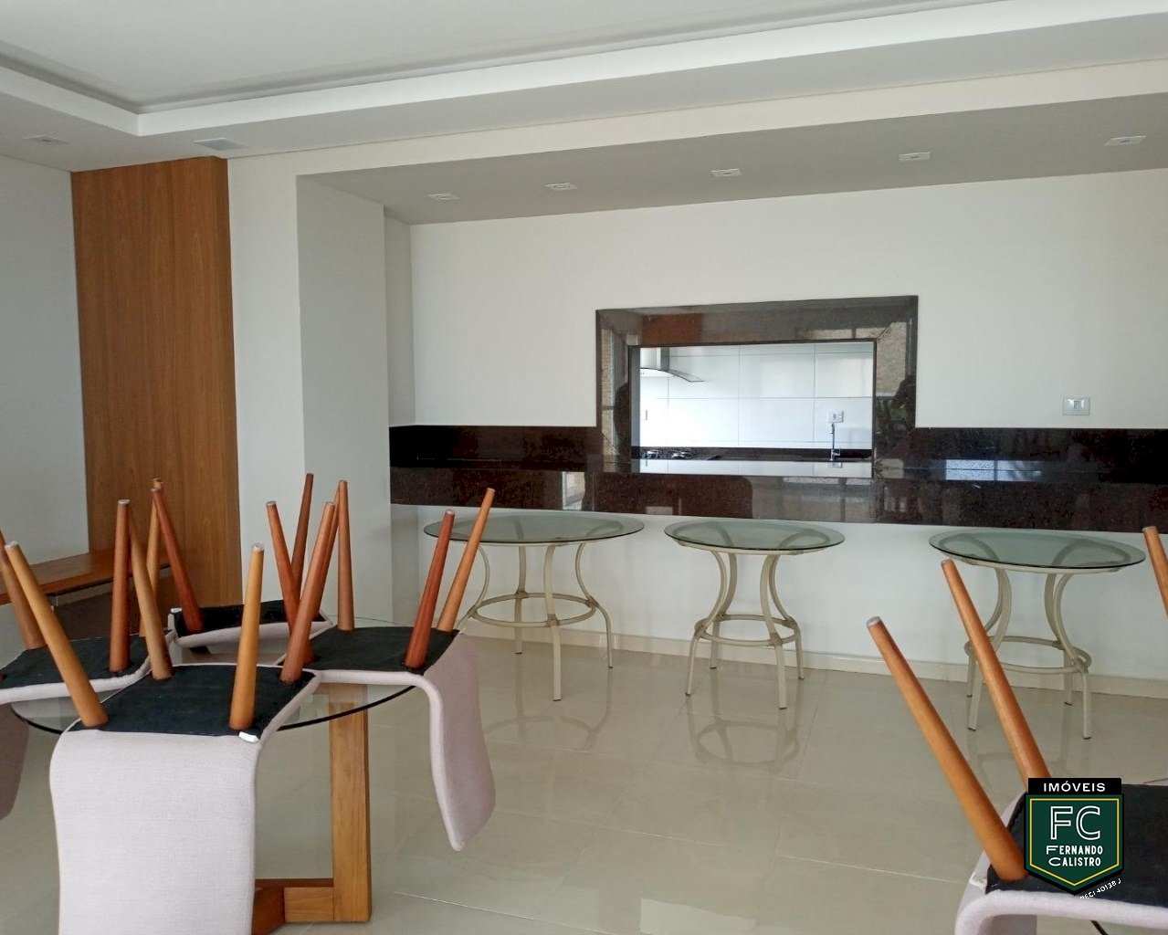 Salão de festas com cozinha profissional integrado ao espaço gourmet