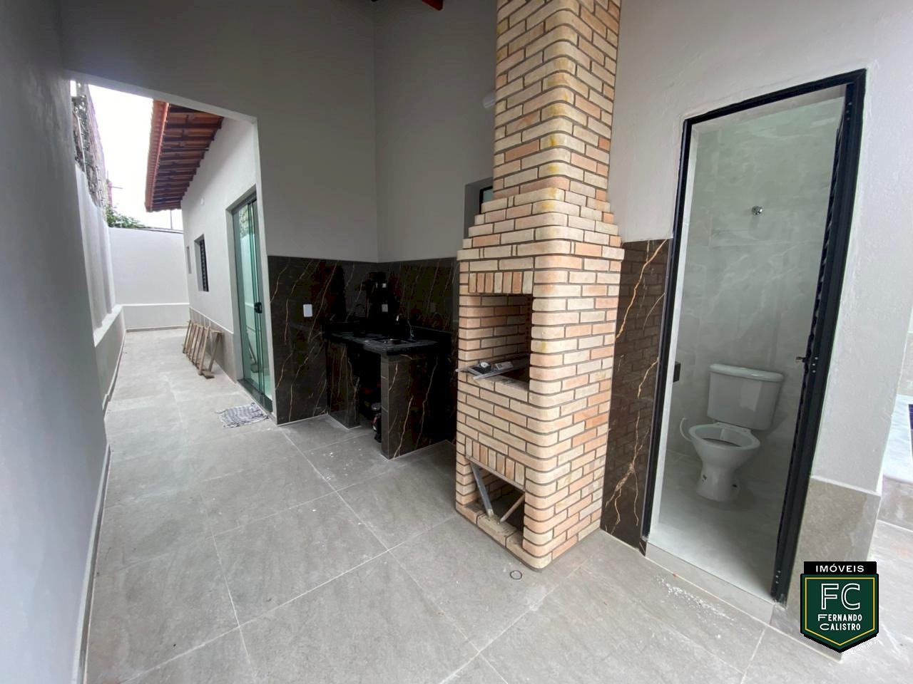 • Varanda gourmet com churrasqueira em tijolinho e pia em granito