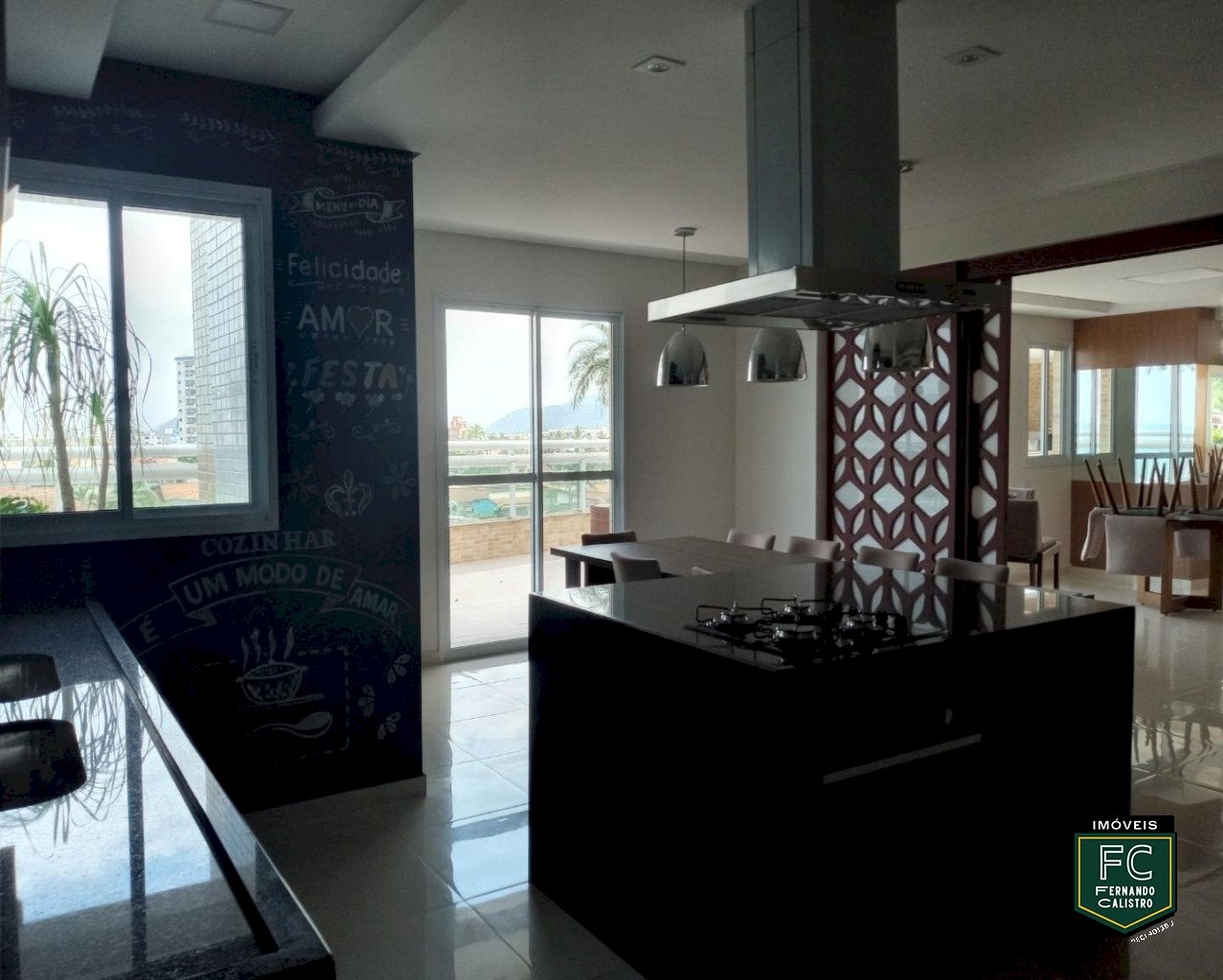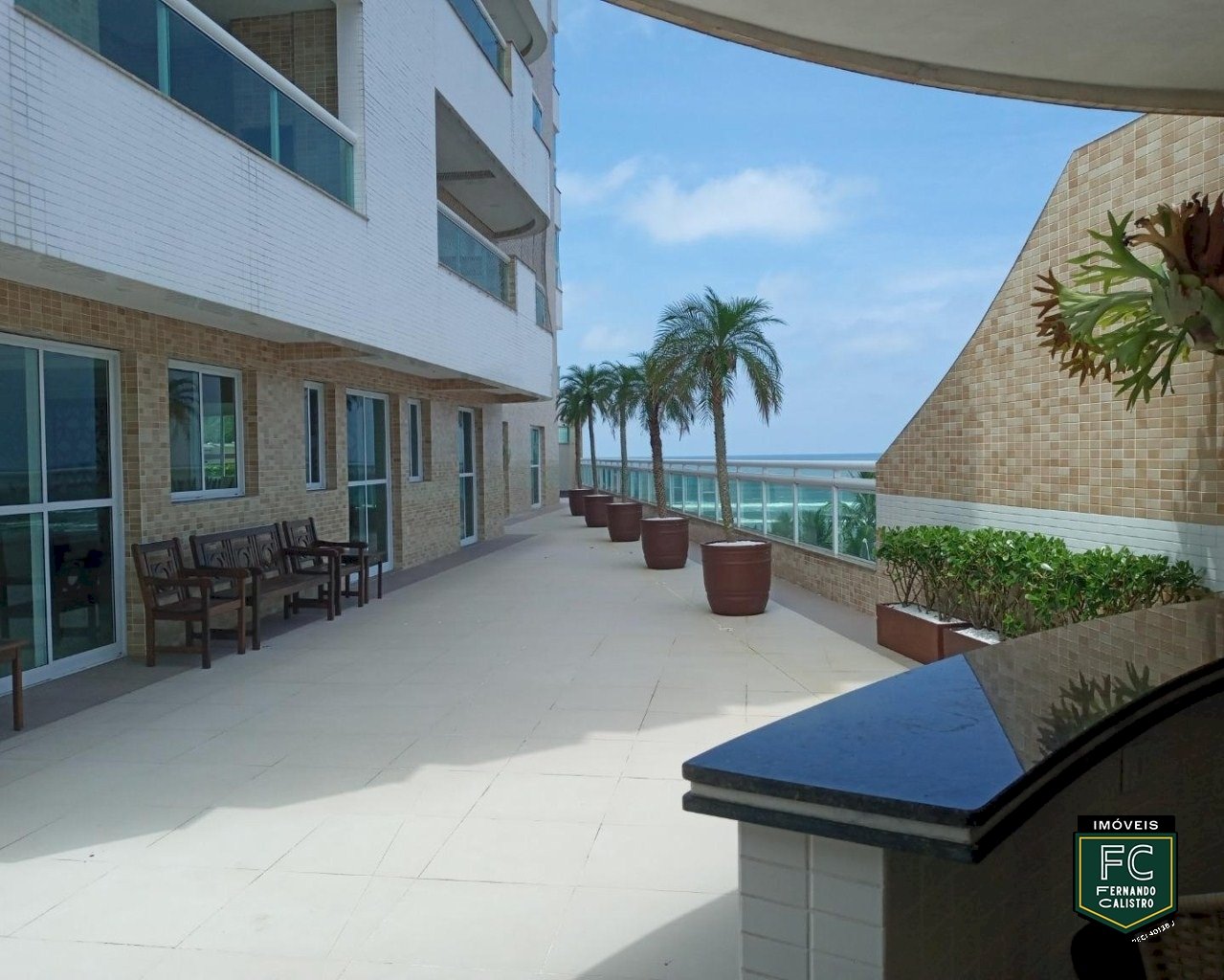Varanda gourmet com churrasqueira e vista frontal para o mar