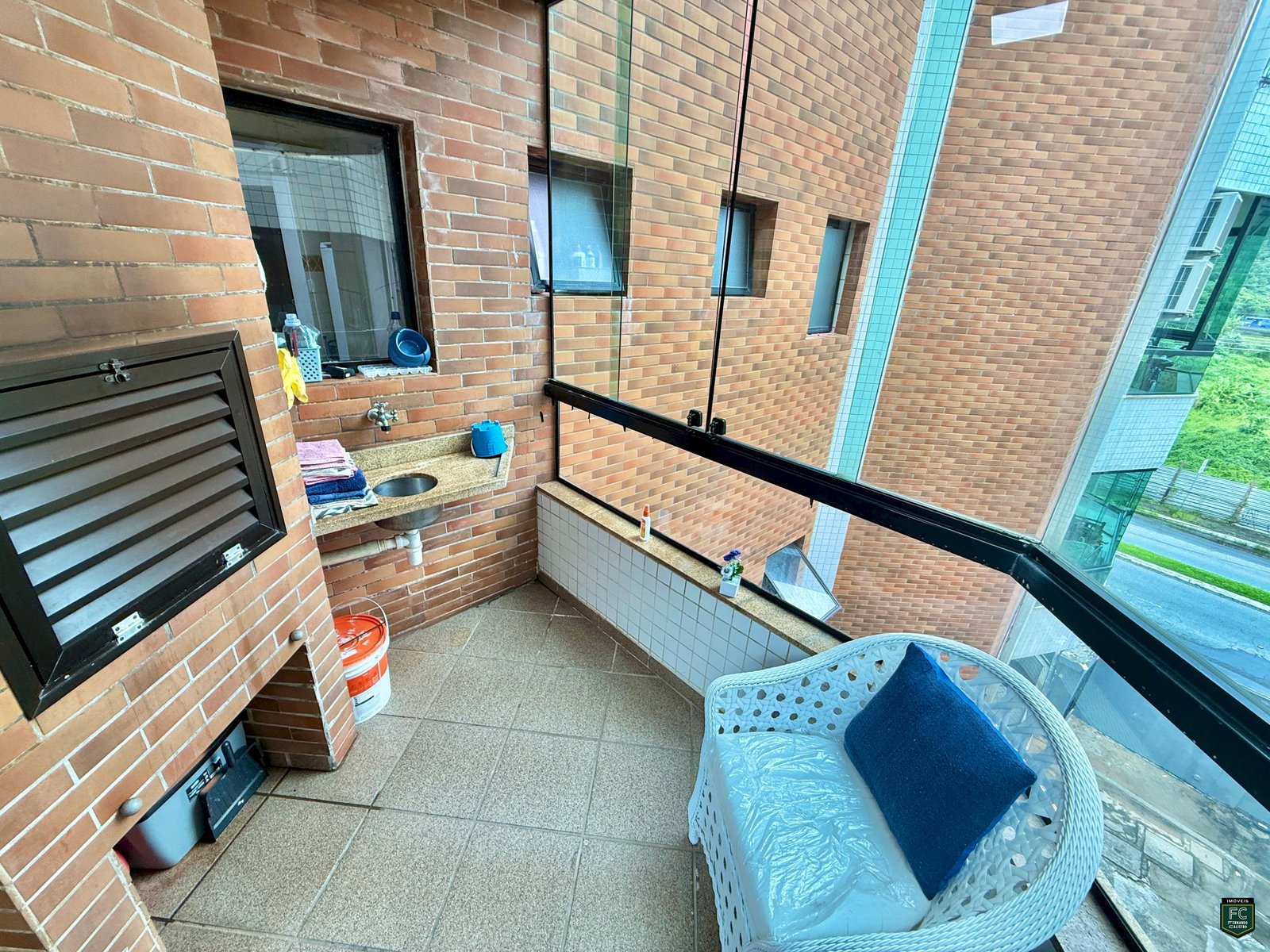 Varanda gourmet envidraçada com churrasqueira a carvão
